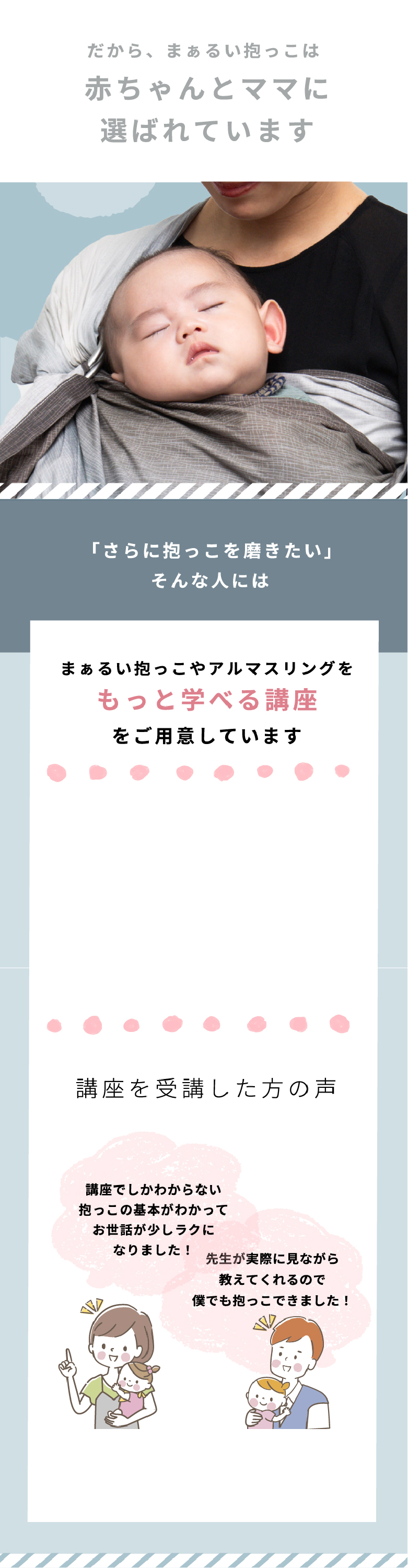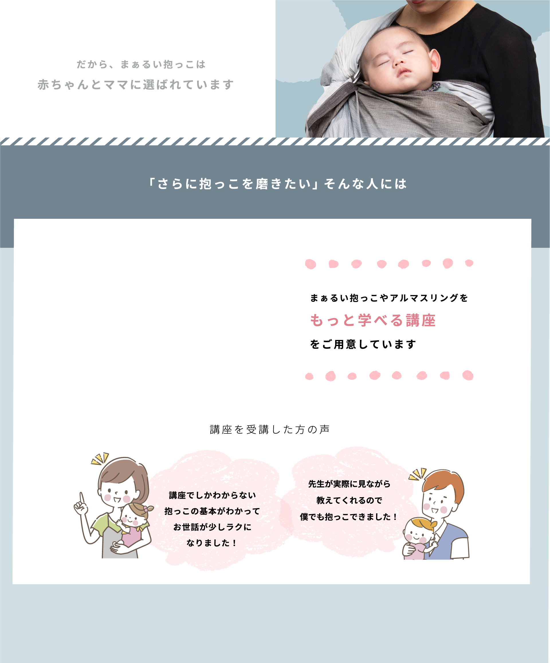 お米が包めるようになったら赤ちゃんと室内で練習し、安全に使えるようになってからお出かけにご使用ください。可能であれば事前に講座を受講されることをお勧めします。